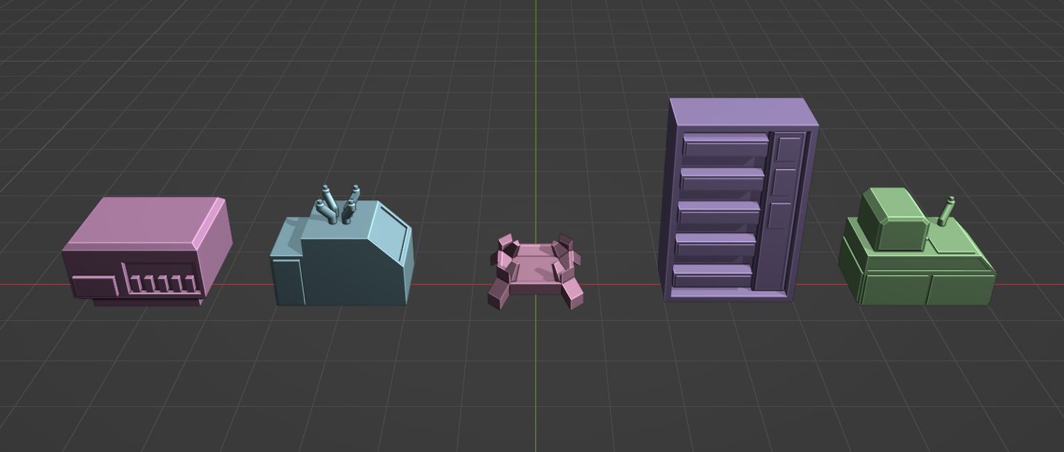 With those notes made, I also quickly took to blender to model out some placeholder meshes for each point. Shown in order; Server, Mainframes, Transmitter/Receiver, Hub, Processor.